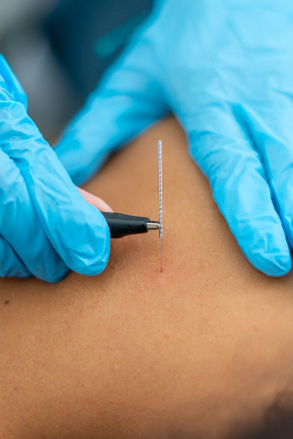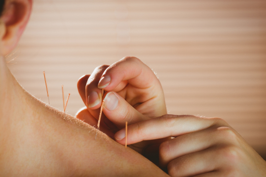 The acupuncturist gently inserts thin, sterile needles into specific acupuncture points on the body.
