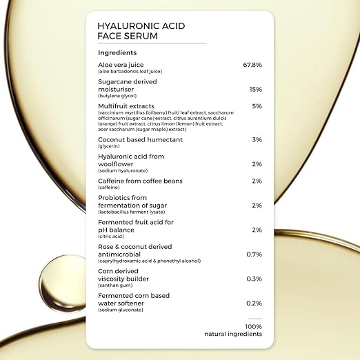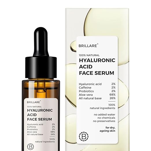 Brillare Hyaluronic Acid face serum is 100% Natural with 2% Hyaluronic acid, caffain, probitics & multifruits extracts.