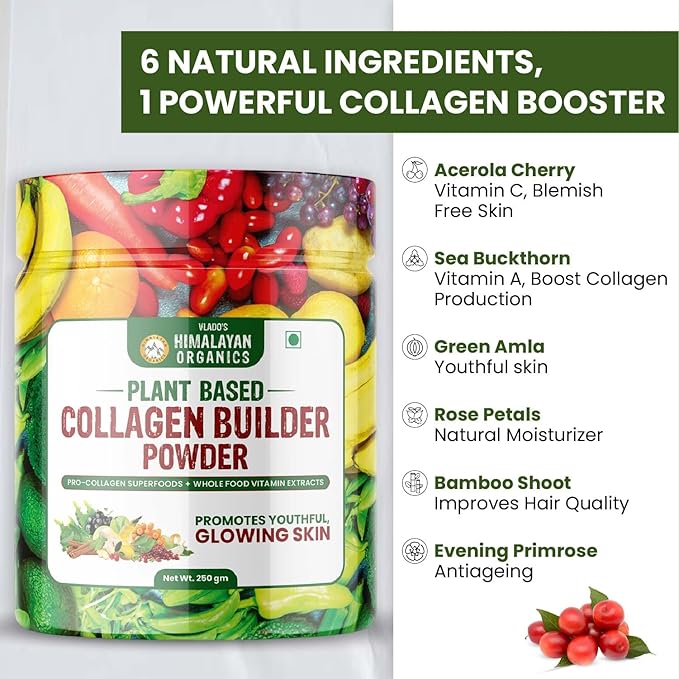 - BOOST COLLAGEN SYNTHESIS: Pollutants in water, air, food, stress, and overexposure to the sun deplete our collagen storehouse, making replenishment vital. It is the major component of connective tissues that make up several body parts, including tendons, ligaments, skin, and muscles. Himalayan Organics Plant-based Collagen Booster Supplement is made from over 20 Real, Nutritious, Plant-based wholefoods with ingredients chosen to help support the bodys own collagen production