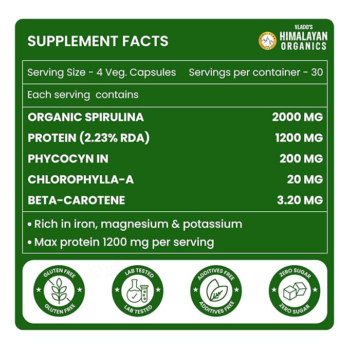 ✔GREEN FOOD FOR GREEN HEALTH: Vlado’s Himalayan Organics Spirulina Capsules is a green superfood for green health. Rich in vitamins, minerals, and antioxidants, Spirulina promotes overall well-being as it regulates blood sugar & cholesterol levels, manages blood pressure, boosts energy levels, enhances endurance, strengthens muscle health, combats oxidative damage, and supports RBCs