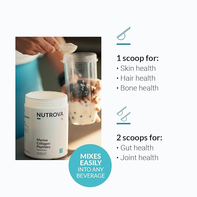 - MARINE COLLAGEN PEPTIDES: This highly pure collagen powder is an alternative to bovine (cow) sources. Nutrova’s hydrolyzed marine collagen peptides has smaller chains of collagen that the body can easily absorb and use. It is also third-party tested for heavy metals.