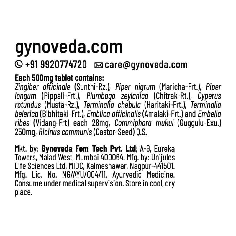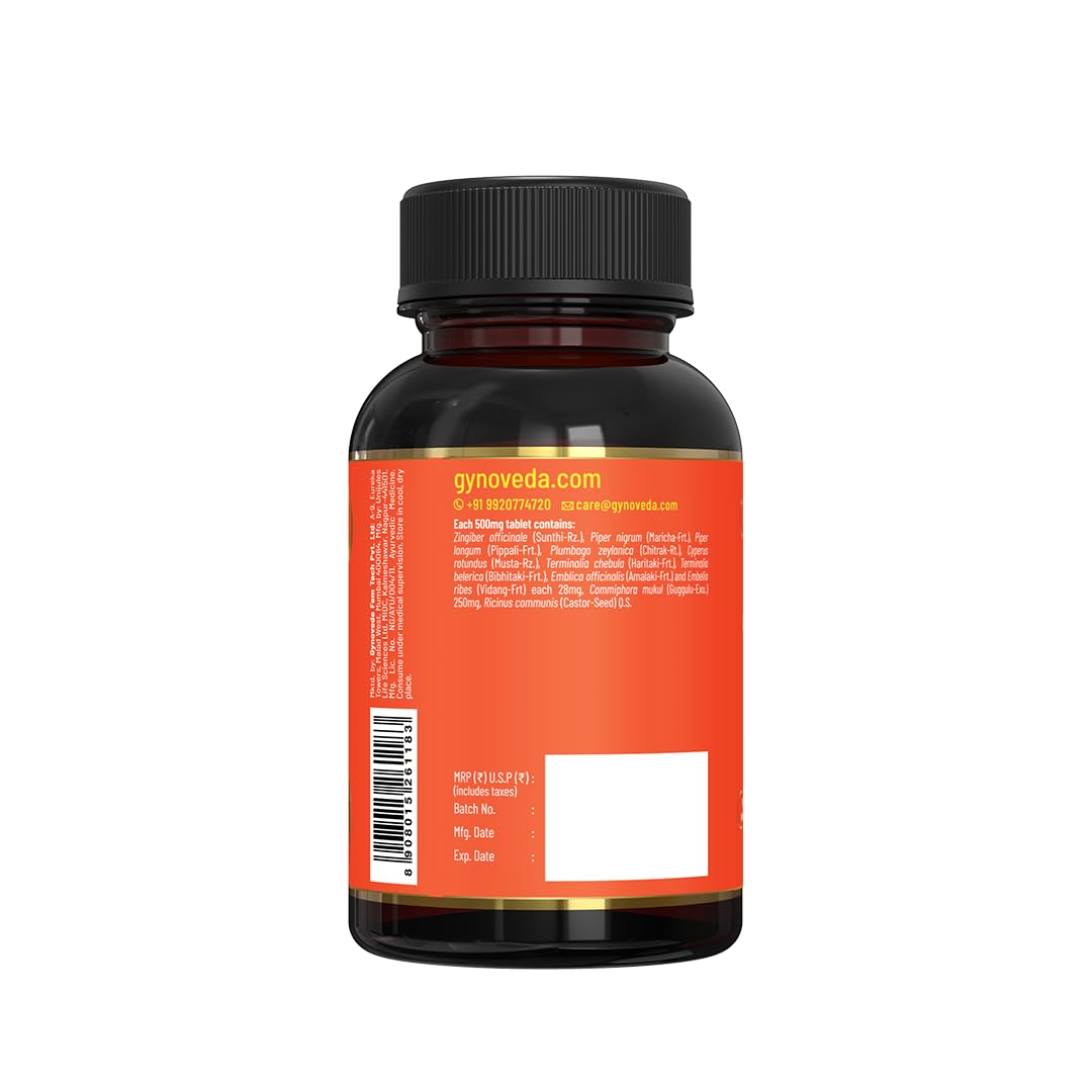 Key ingredients: Guggulu boosts metabolism, Triphala detoxifies, Mustak & Trikatu aid digestion, and Vidang removes bad gut bacteria.