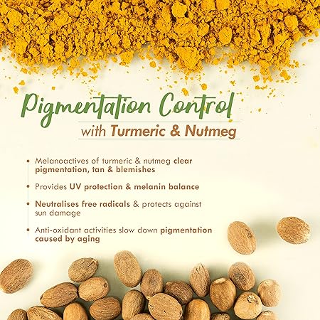 - Pigmentation Control – Melanoactives of turmeric & nutmeg clear pigmentation, tan & blemishes.Antioxidant activities slow down pigmentation caused by ageing.