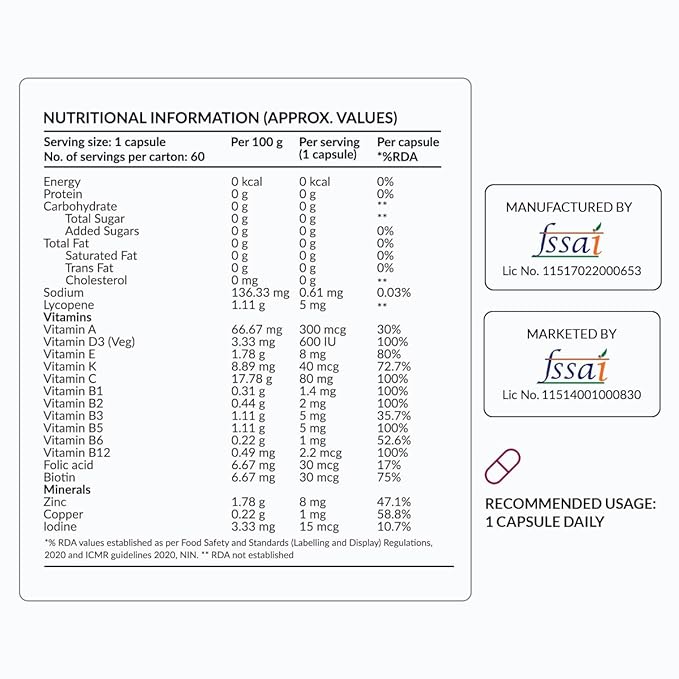 • CONTAINS MINERALS, VITAMINS & ANTIOXIDANTS: Contains Lycopene, vitamin C, Zinc Citrate, tocotrienol-rich vitamin E, vegan source of cholecalciferol (vitamin D3), vitamin B3, vitamin B5, vitamin A acetate (A.K.A. ‘retinyl acetate’, vitamin A’s natural form), copper sulphate, vitamin B2, vitamin B12 and more.