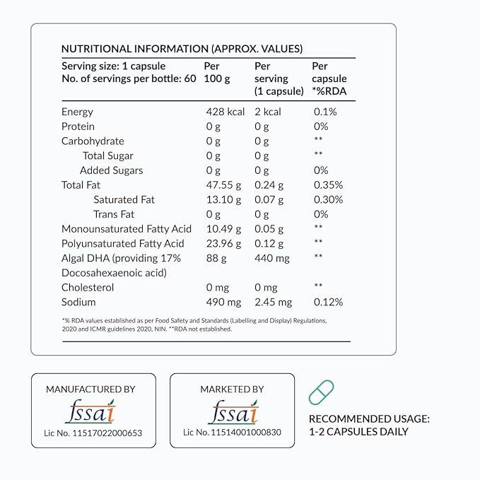 - LONG CHAIN OMEGA 3 FAT: The anti-inflammatory, long-chain omega 3 fat, DHA, is not found in vegan sources of food. Sources like flaxseed, chia seeds and walnuts provide the omega 3 fat ALA, and its conversion to DHA in our body is poor. Each capsule provides 74mg vegan DHA.