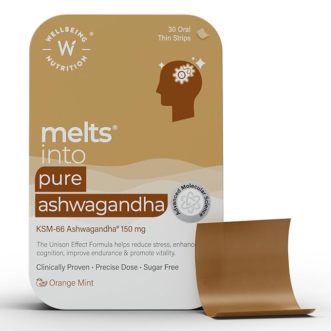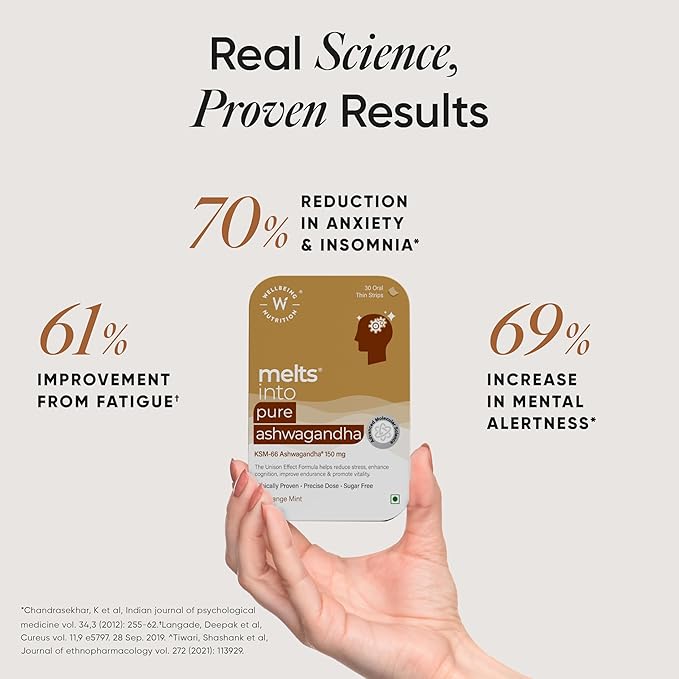 • ADVANCED MOLECULAR SCIENCE Fast acting and all-natural, plant-based melts Pure Ashwagandha is 95% more bioavailable than traditional tablets/capsules/sugar filled gummies. Our Patented Nano technology converts plant extracts into nanoparticles and the sublingual, quick dissolve delivery system ensures the actives are directly released into the bloodstream for complete absorption. This results in instant action and faster results at lower doses to ensure reduced stress, improved cognition, endurance & overall vitality.