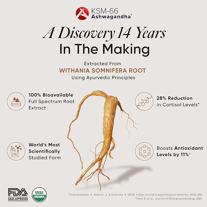 • TESTED FOR SAFETY & EFFICACY Backed by gold-standard clinical trials, it is extracted exclusively from the roots using ayurvedic principles that preserves its full therapeutic potential for maximum efficacy. KSM-66 Ashwagandha is the most certified botanical, meeting the highest safety and quality standards with 35+ Certfications. It is GMP, USDA Organic, Non-GMO project verified, Gluten-Free, Drug-Free, Halal and HACCP Certifed. It meets the WHO GMP standards and is clean label project certified.