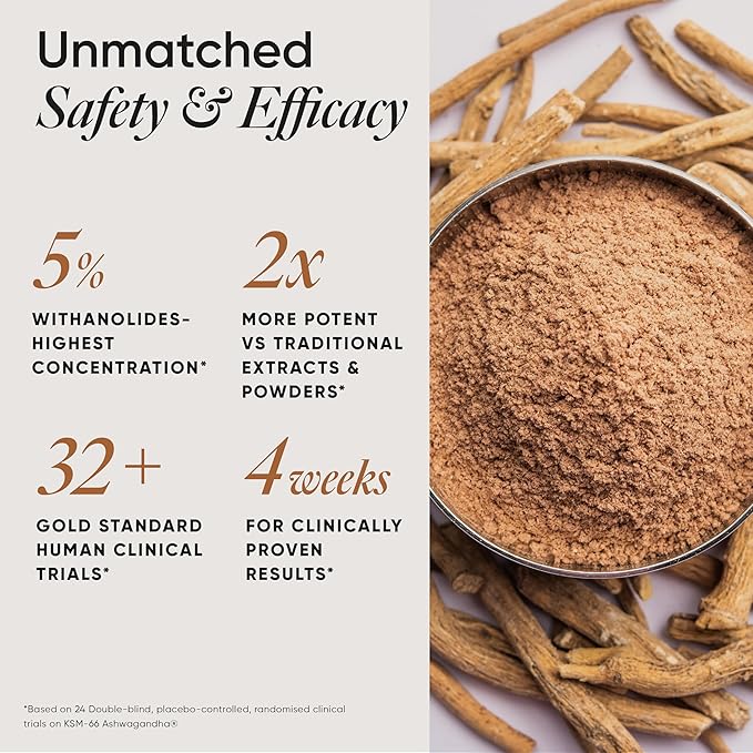 • PROVEN IN 32+ GOLD STANDARD CLINICAL TRIALS Validated by 32+ human clinical trials, our formula delivers 4-8 weeks for clinically proven results—setting a new benchmark in efficacy. KSM-66 Ashwagandha has been scientifically proven to reduce stress by 34%, improve sleep quality by 35%, and lower cortisol levels by 16%. It also supports thyroid health by increasing T3 and T4 levels by 10% and 4%, respectively, while reducing TSH levels by 35%. Additionally, it enhances cognitive function, boosts endurance by 16%, increases muscle strength by 52%, and reduces Serum Creatinine by 7%, aiding faster recovery and overall well-being.