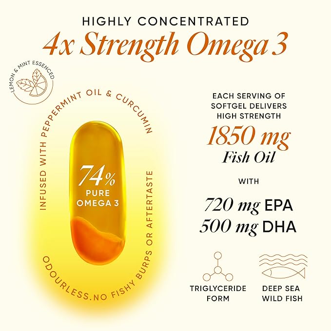 4X STRENGTH OMEGA-3 WITH CURCUMIN & PEPPERMINT: Delivers 1850 mg fish oil with 720 mg EPA & 500 mg DHA in highly absorbable triglyceride form—1.7x more bioavailable than ethyl esters. Infused with Curcumin (95% Curcuminoids) for joint, brain & immune support, plus Peppermint Oil for digestion & a fish-free aftertaste. Clinically proven to support heart, skin & recovery. Sustainably sourced, mercury-free, molecularly distilled & third-party tested. Non-GMO, allergen-free, GMP & FDA certified.